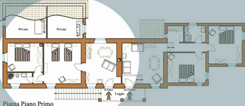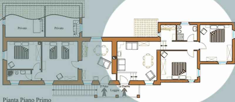 Il Falco si trova al piano primo: è il cuore della vecchia casa contadina. Un trilocale composto da cucina-soggiorno con divano letto matrimoniale, camera con due letti singoli, camera letto matrimoniale e bagno.
